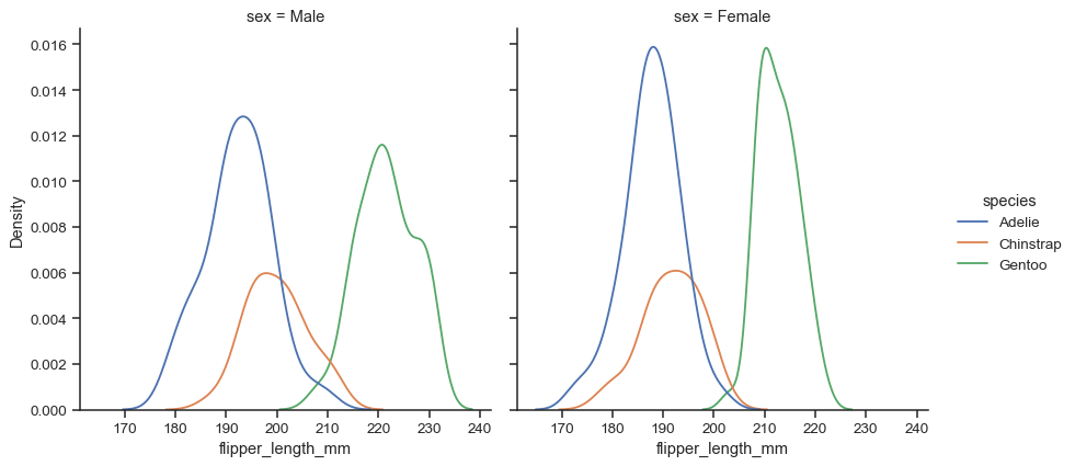 FacetGridを使用して構築されます。つまり、個別のサブプロット、つまり「ファセット」にサブセットを表示することもできます。sns.displot(data=penguins, x="flipper_length_mm", hue="species", col="sex", kind="kde")