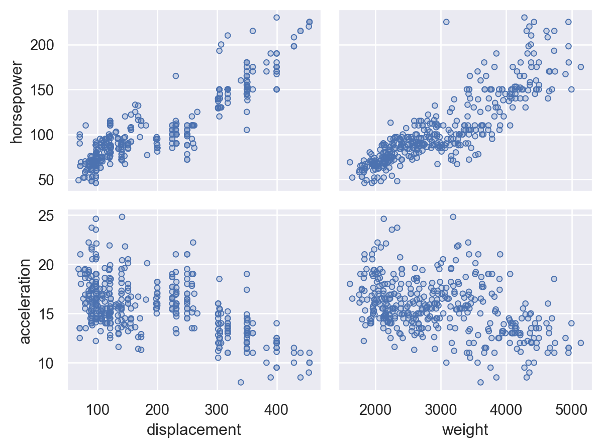 ( so.Plot(mpg) .pair( x=["weight", "acceleration"], y=["displacement", "horsepower"], cross=False, ) .add(so.Dots()) )