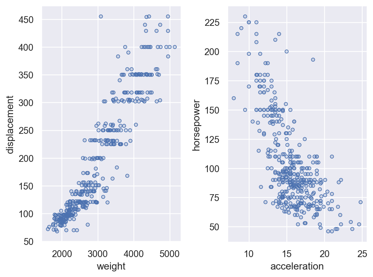 ( so.Plot(mpg["weight"]) .pair(y=[mpg["horsepower"], mpg["acceleration"]]) .add(so.Dots()) )