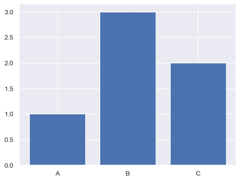 sns.set_theme() sns.barplot(x=["A", "B", "C"], y=[1, 3, 2])